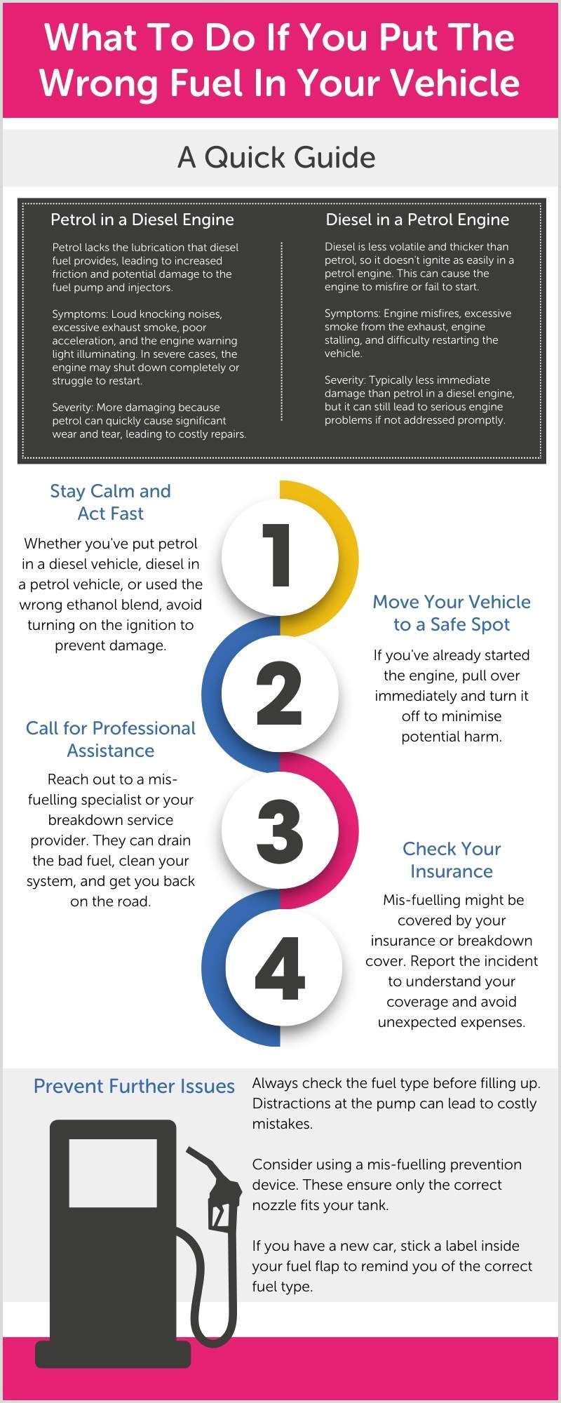 Whether you've accidentally put petrol in a diesel car or diesel in a petrol car, the key is to remain calm and take the right steps to minimise damage to the engine. This guide takes you through what you need to do, if you find yourself in this situation. It also aims to help you to understand the potential consequences of mis-fuelling and how to avoid it in the future.
