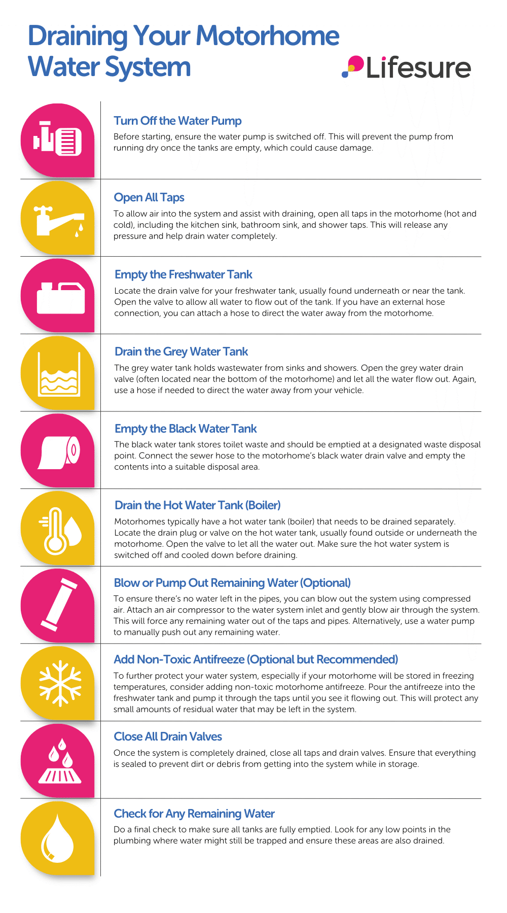 Freezing temperatures can cause serious damage to your motorhome’s water systems if not managed correctly. Water expands when it freezes, which can cause pipes, tanks, and even the boiler to crack, so it’ll essential to make sure these are drained of water, before your motorhome goes into storage.