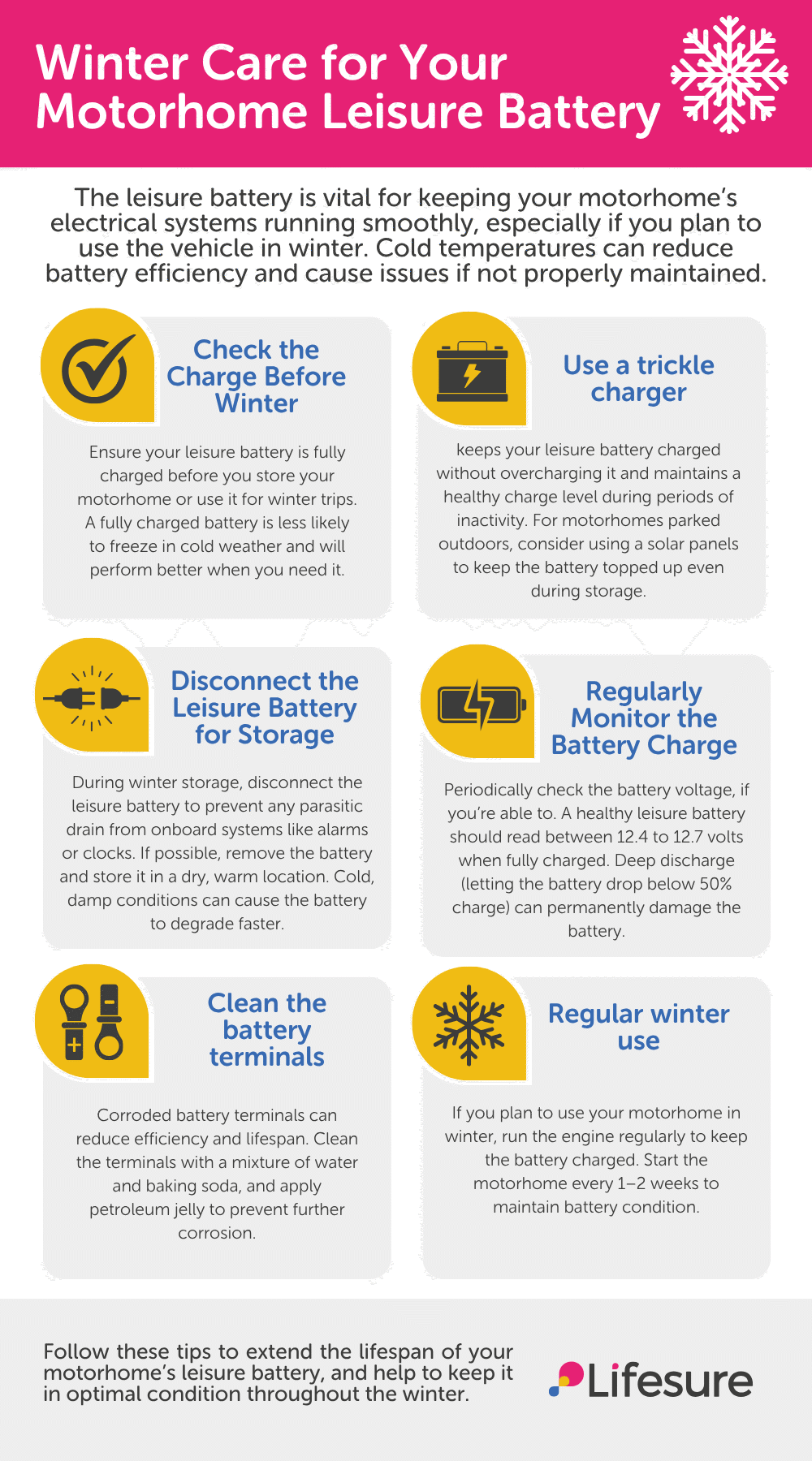 Cold temperatures can negatively affect battery performance, reducing their capacity and making it harder to start your motorhome or power your leisure systems. In winter, batteries also drain faster, especially if your motorhome is not connected to an external power source.