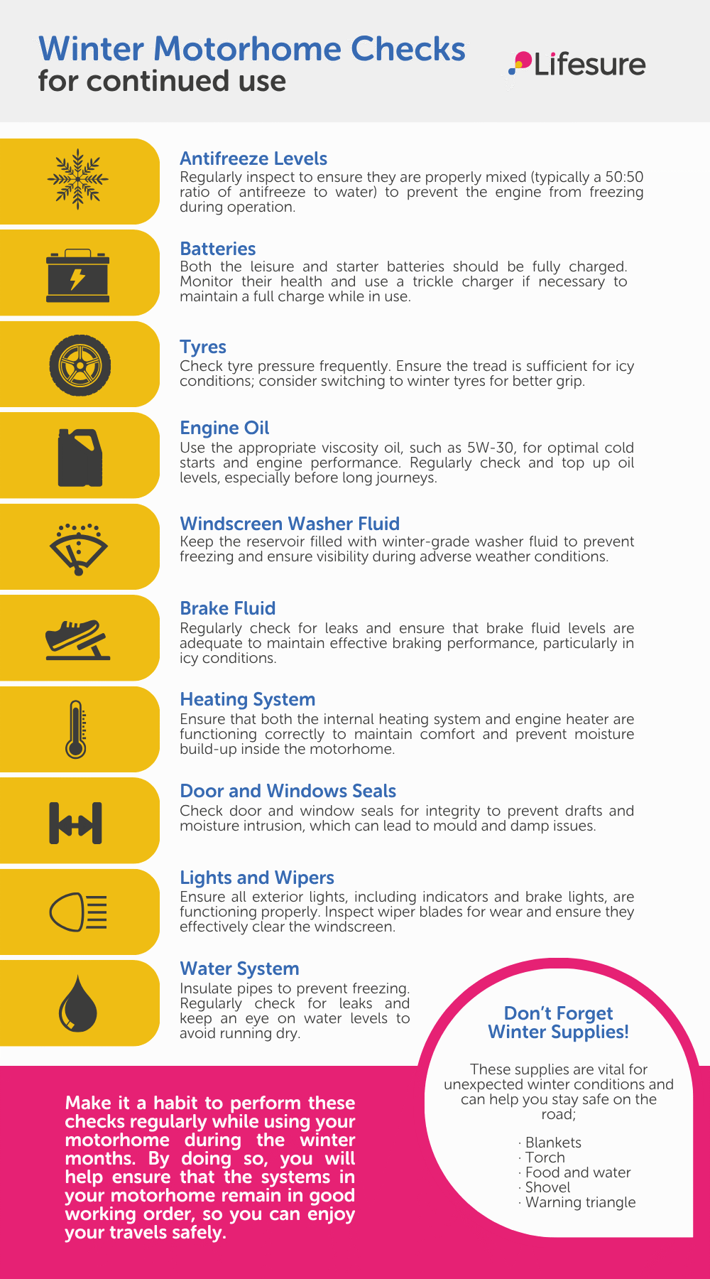 Whether you're storing your motorhome or using it throughout winter, these key checks will help keep your motorhome in top condition: