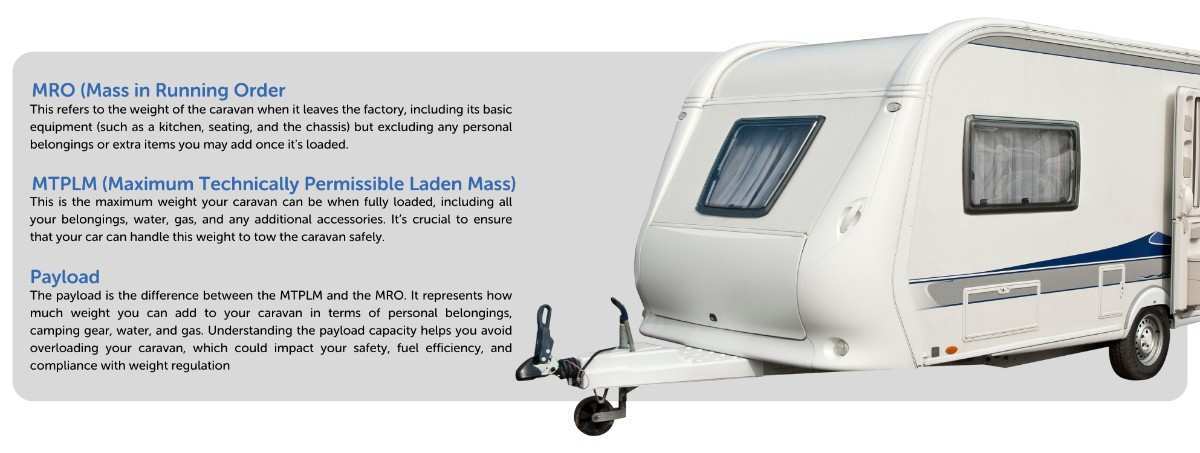 - MRO (Mass in Running Order): This refers to the weight of the caravan when it leaves the factory, including its basic equipment (such as a kitchen, seating, and the chassis) but excluding any personal belongings or extra items you may add once it's loaded.
